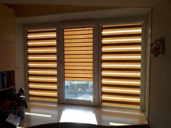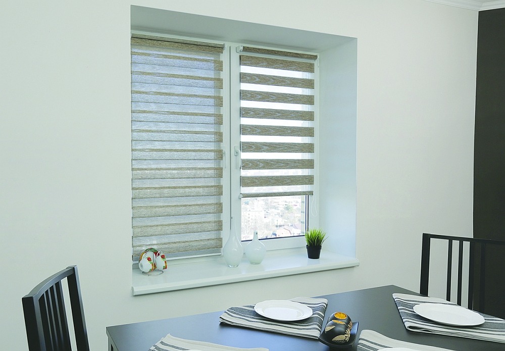 Рулонные шторы зебра(DUO) -солнцезащитные оконные ,системы ,состоящие из сложенного вдвое полотна ткани,имеющего чередующиеся прозрачные и непрозрачные полосы,и металлического вала ,на который на матывается ткань.Данные изделия имеет две системы :с креплением на створку или на проем.Система с креплением на створку может изготавливаться с декоративным коробом с направляющими по бокам